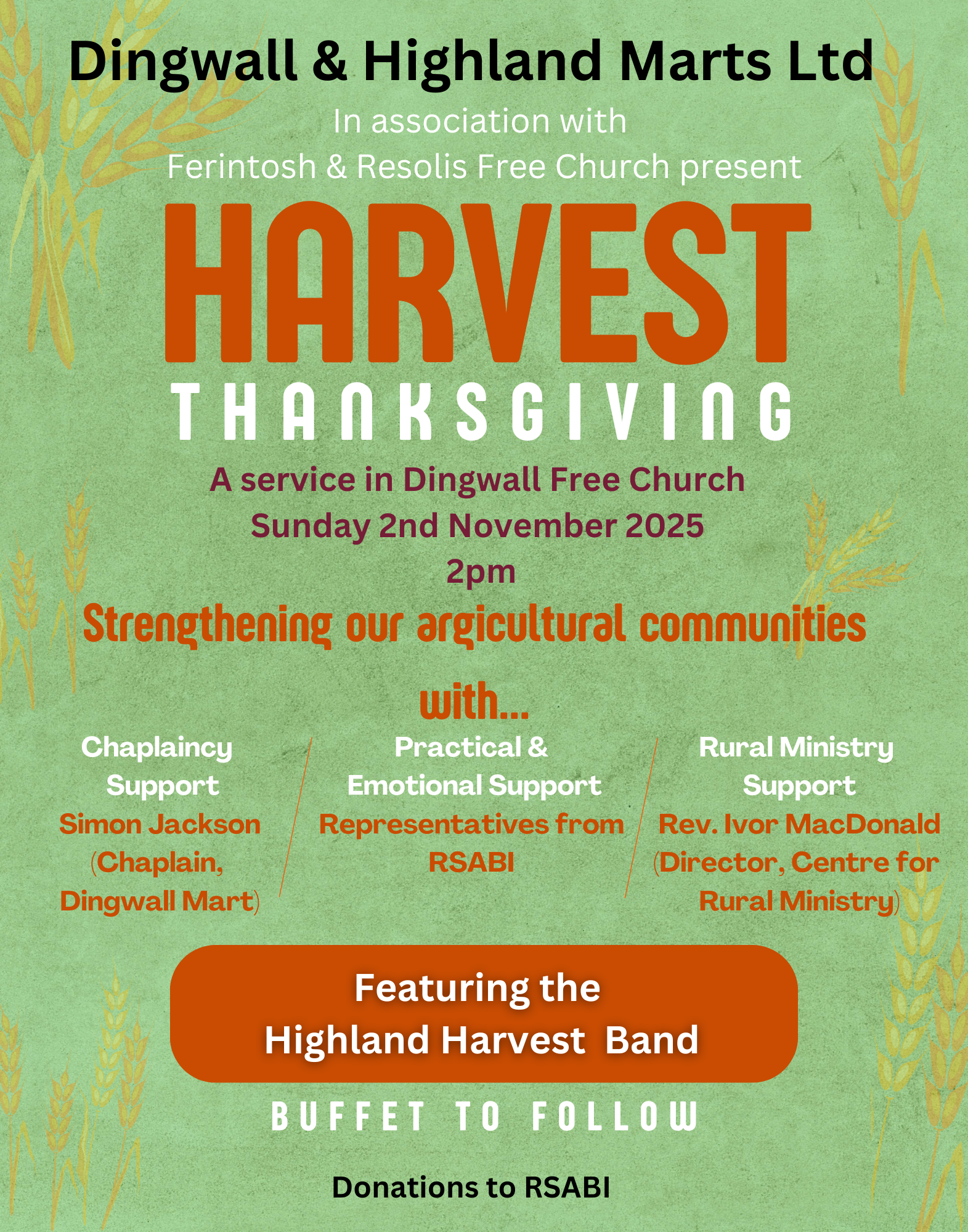 On Sunday 2 November at 2 pm, we will be hosting a Harvest Thanksgiving Service in association with Dingwall & Highland Marts Ltd and Ferintosh & Resolis Free Church. There will be a buffet tea following the service. Everyone is welcome.